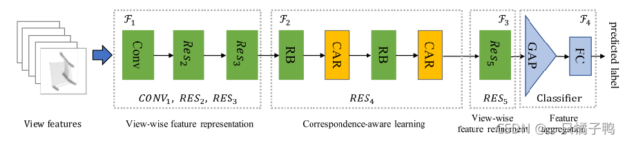 - (F2)学习Correspondence-aware表示。考虑到F1中的所有视图的特性,第二部分F2基于两个顺序的CAR模块捕获并利用它们的视图对应关系。这一步将为所有视图生成一个对应感知的特征张量。