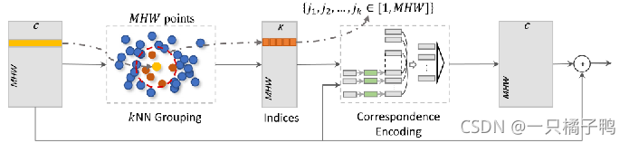 将具有一定视图的三维物体生成的视图表示在语义特征空间中。将每个视图的每个位置的局部特征看作语义空间中的一个点,所有的特征都表示为嵌入语义空间的一个点集。kNN搜索用于寻找空间中每个点的K个潜在对应。我们的CAR模块通过利用这些基于视点和视图内位置的潜在对应的空间关系,学习输出对应感知表示。