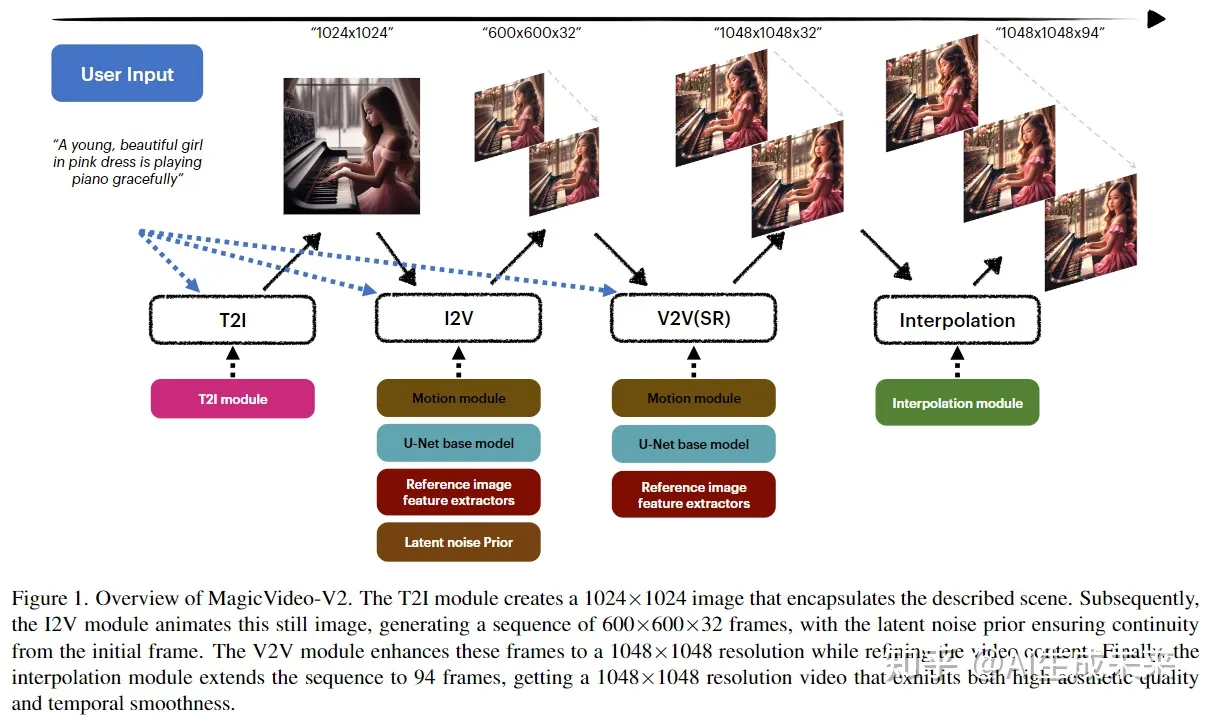 MagicVideo-V2:多阶段高保真视频生成框架 本项工作介绍了MagicVideo-V2,将文本到图像模型、视频运动生成器、参考图像embedding模块和帧内插模块集成到端到端的视频生成流程中。由于这些架构设计的好处,MagicVideo-V2能够生成具有极高保真度和流畅度的美观高分辨率视频。通过大规模用户评估,它在性能上表现优越,超过了领先的文本到视频系统,如Runway、Pika-1.0、Morph、Moon Valley和Stable Video Diffusion模型。