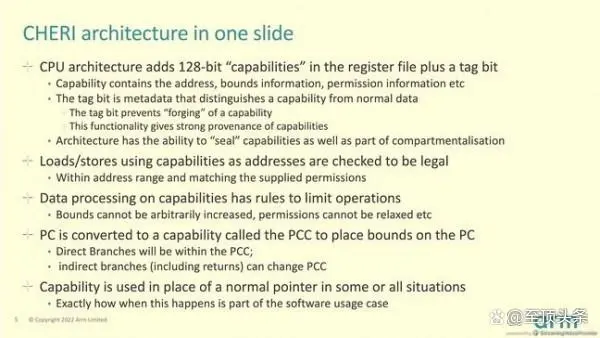 Grisenthwaite提到,“在建立起这套功能体系之后,我们就可以用能力来全面替代以往保存在通用寄存器内的部分或全部地址,由此建立起更高的安全性基础。”