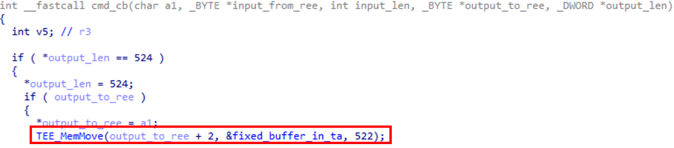 最后,CB命令获取包含未包装数据的缓冲区,并将其一部分返回给REE。请注意,由于类型混淆漏洞,目标地址也可以设置为指向TA内部内存。