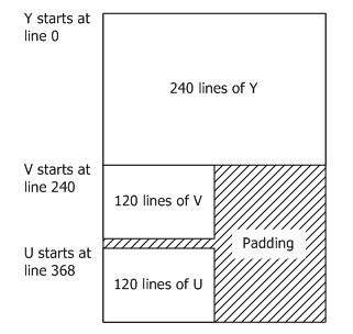 U和V平面必须从16行的倍数的内存边界开始。图5显示了352 x 240视频帧的U和V的原点。U和V平面的起始地址计算如下: