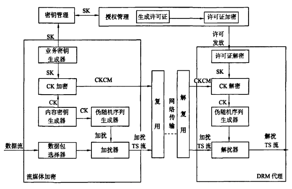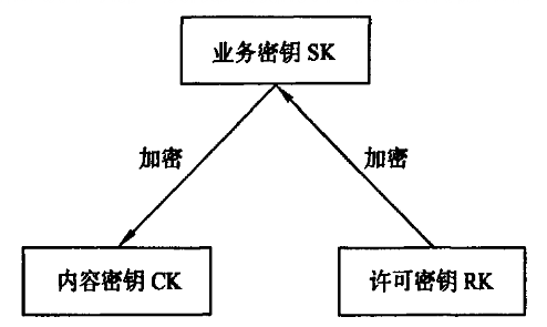内容密钥用于对TS流加扰;业务密钥用于对内容密钥加密,存放在密钥管理数据库中;许可密钥用于对由业务密钥和用户权限组成的许可证进行加密。