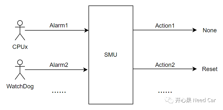 我们知道,对于一款芯片,除了CPU(Central Processing Unit),还有大量的外设模块,他们相互配合,实现预期功能。既然是独立的硬件个体,在某些工况下,就会存在失效的可能性。为了便于管理这些失效场景,需要一个统一的大总管收集这些异常信息,之后,在对这些异常模块进行对应的处理策略。而收集异常信息的大总管就是SMU,上报异常信息的单元通过Alarm将信息通知给SMU,示意如下: