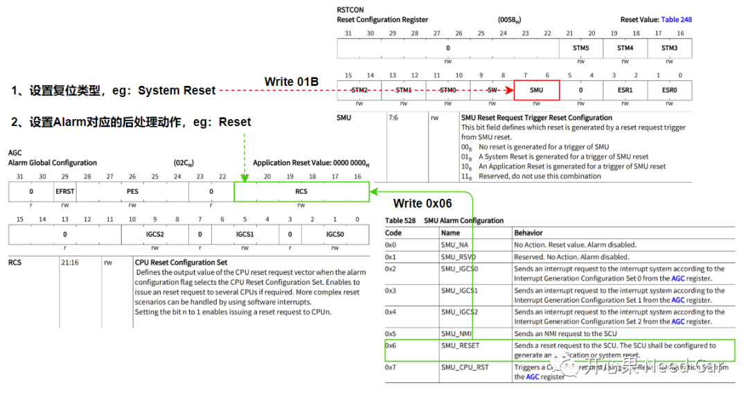 **实际工程中,触发Reset,是最常用的alarm处理行为。**注意,系统的Reset类型有多种,而alarm可以产生的复位类型有Application Reset和System Reset。如果选择SMU_RESET(System Reset),则需要软件提前配置好复位类型,具体软件设置操作如下: