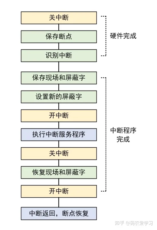 - 恢复现场和屏蔽字:使现场和屏蔽字恢复到中断之前的状态