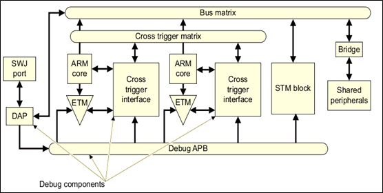 一个DAP,DAP内实现了多个AP,这些AP实现jtag或memory-mapped方式访问debug资源。