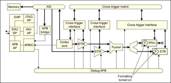 同时APB总线还连接到了系统的debug apb上,实现对系统的coresight组件的寄存器访问。如funnel,ETB,TPIU,CTI等。