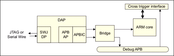 外部对DP访问,DAP将DP访问,转化为AP访问,AP通过APBIC,生成AP总线,通过bridge,对ARM core中的debug资源,或者挂接在debug APB上的coresight组件,进行访问。