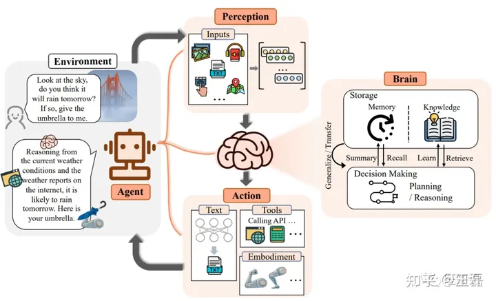 人工智能体(AI Agent)总体框架由大脑、感知、行动三个关键部分组成 :