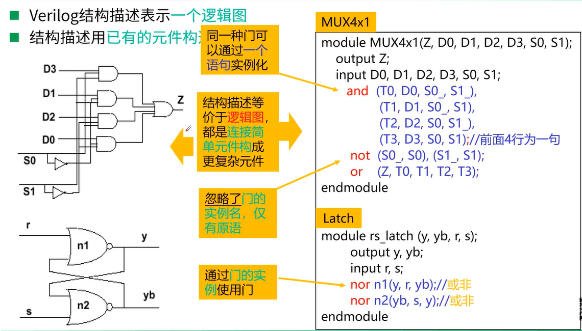 结构描述等价于逻辑图,它们都是连接简单元件来构成更为复杂的元件;Verilog使用其连接特性完成简单元件的连接;
