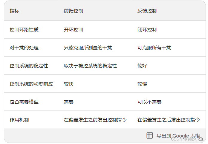 前馈和反馈 前馈特点:速度快,不需要检测输出量,需要系统模型,模型不精确的时候结果也不精确。反馈特点:检测输出量并且和预想值进行对比,可以不需要系统模型,速度比前馈慢。结果完完全全是预想值。前馈控制需要模型。反馈控制可以不需要模型。前馈控制,需要得到一个输出的时候,输入信号可以被事先推算出来,这样给了输入信号之后,输出信号就是想要的值。反馈控制不需要事先知道输入信号。它只检测输出信号。当输出信号低于预期值时,反馈系统会改变输入量,使得输出量增加。前馈控制系统在受控部位的活动发生偏差之前就发出控制指令了。反馈控制系统感受