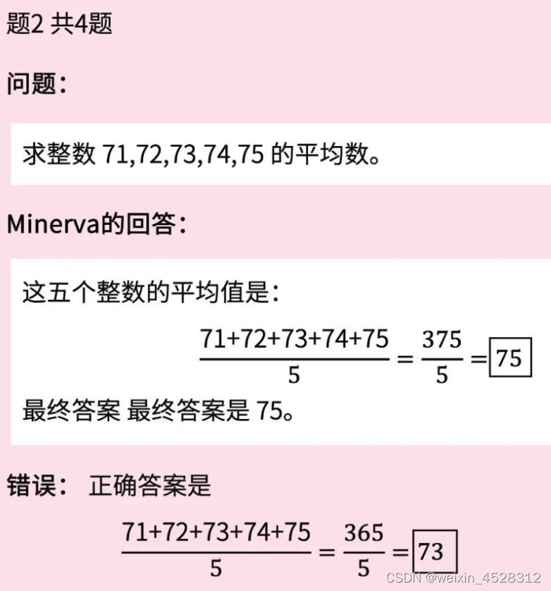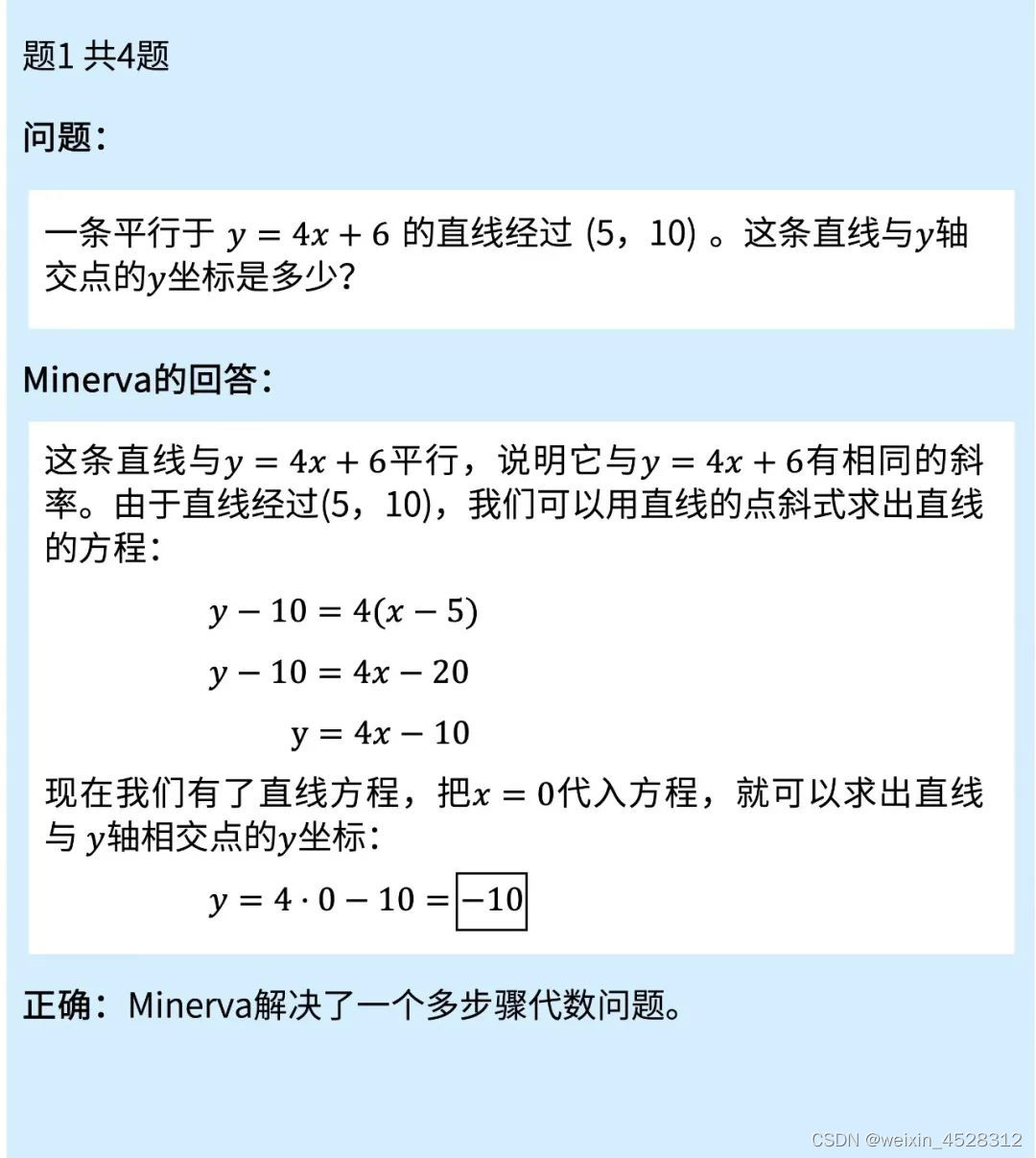 一个称为Minerva的大语言模型在“数学”数据集(中学水平的数学题)中得分50%。上面是它答对和答错的两题。