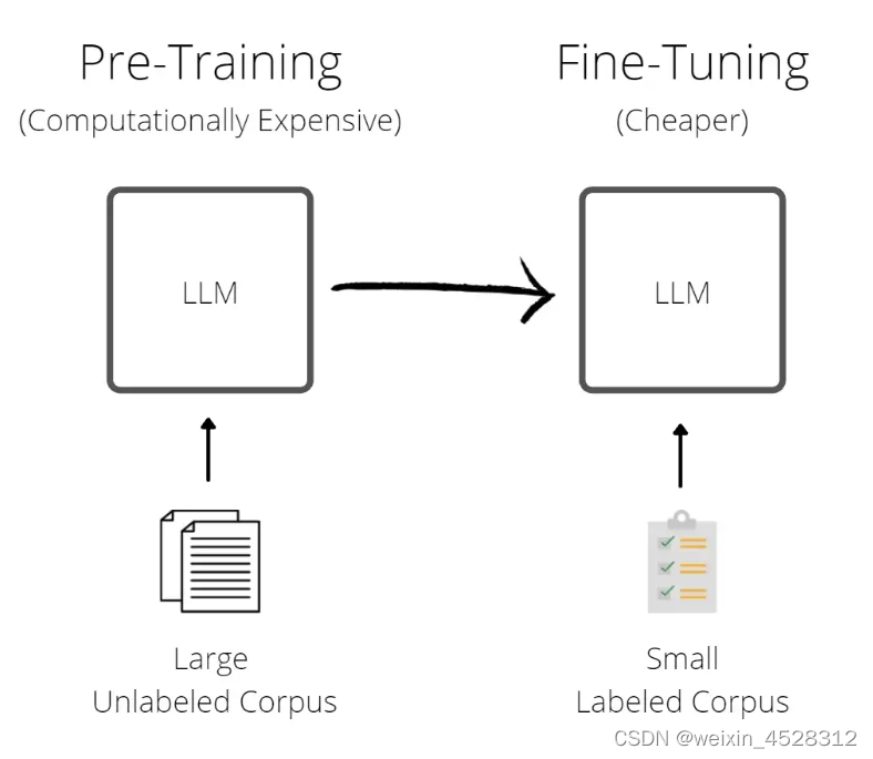 LLM的训练过程包括两个主要步骤:预训练(pre-training)和微调(fine-tuning):(1)在预训练阶段,模型从一个巨大的、多样化的数据集中学习,通常包含来自不同来源的数十亿词汇,如网站、书籍和文章。这个阶段允许模型学习一般的语言模式和表征。(2)在微调阶段,模型在与目标任务或领域相关的更具体、更小的数据集上进一步训练。这有助于模型微调其理解,并适应任务的特殊要求(如下图)。