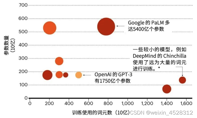 过去几年里,AI的大型语言模型使用了更多的算力和参数来训练。一些较小而表现更佳的模型也出现了,但是他们需要更多的数据来训练。图中的⭕️的大小表示AI训练的次数,黄色、橙色、红色分别表示模型生成的时间(2020,2021,2022)。