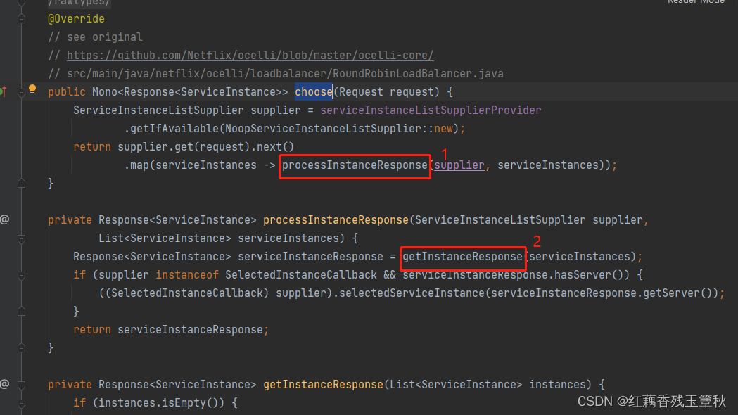 我们参考这个类实现自己的负载均衡策略即可,RoundRobinLoadBalancer实现了ReactorServiceInstanceLoadBalancer这个接口,实现了choose这个方法,如下图: