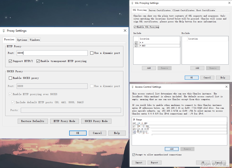 c.Charles的'Proxy Setting'、'SSL Proxying Setting'、'Access Control Setting'没配好;