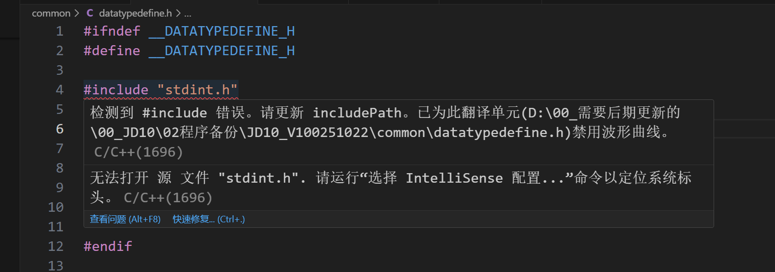 包含的头文件有波浪线,把鼠标停留在波浪线上时,弹出如下图的错误提示。