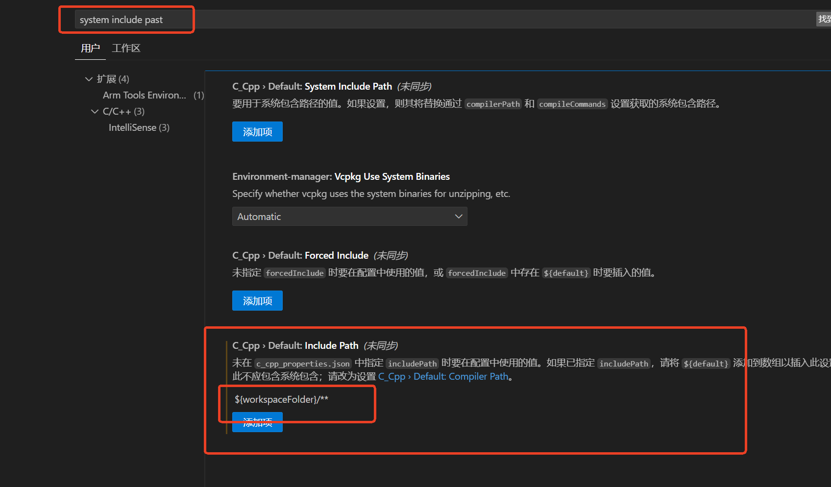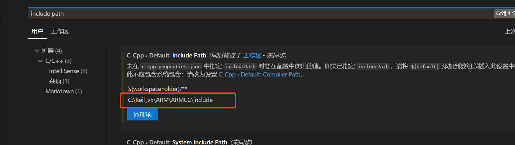 2、找到C_CppDefault:IncludePath 选项,增加${workspaceFolder}/**配置,则系统会自动关联工程内的其他文件中的结构体声明。