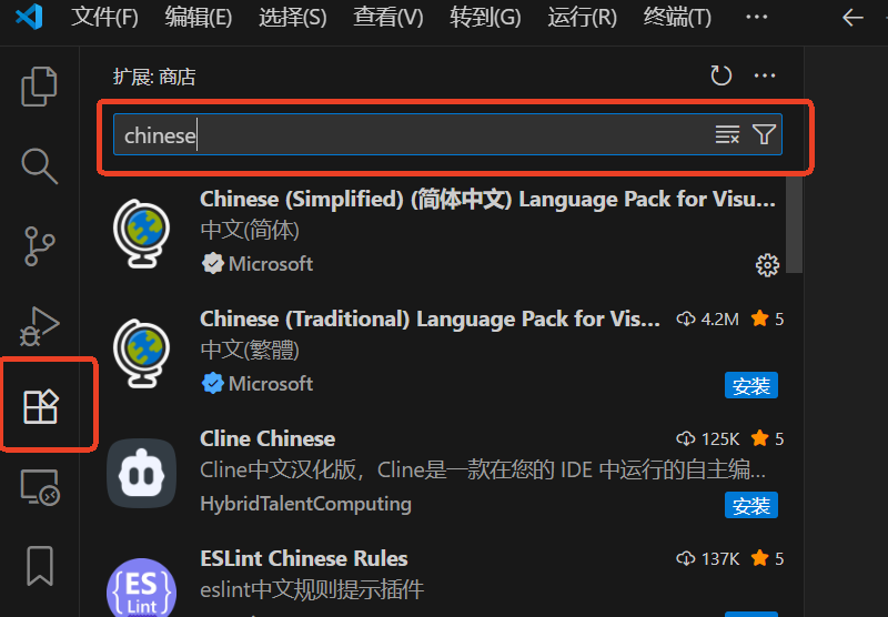 安装插件的步骤如下图所示,点击左侧的插件栏,在搜索框中输入查找的插件信息,找到对应的插件安装即可。
