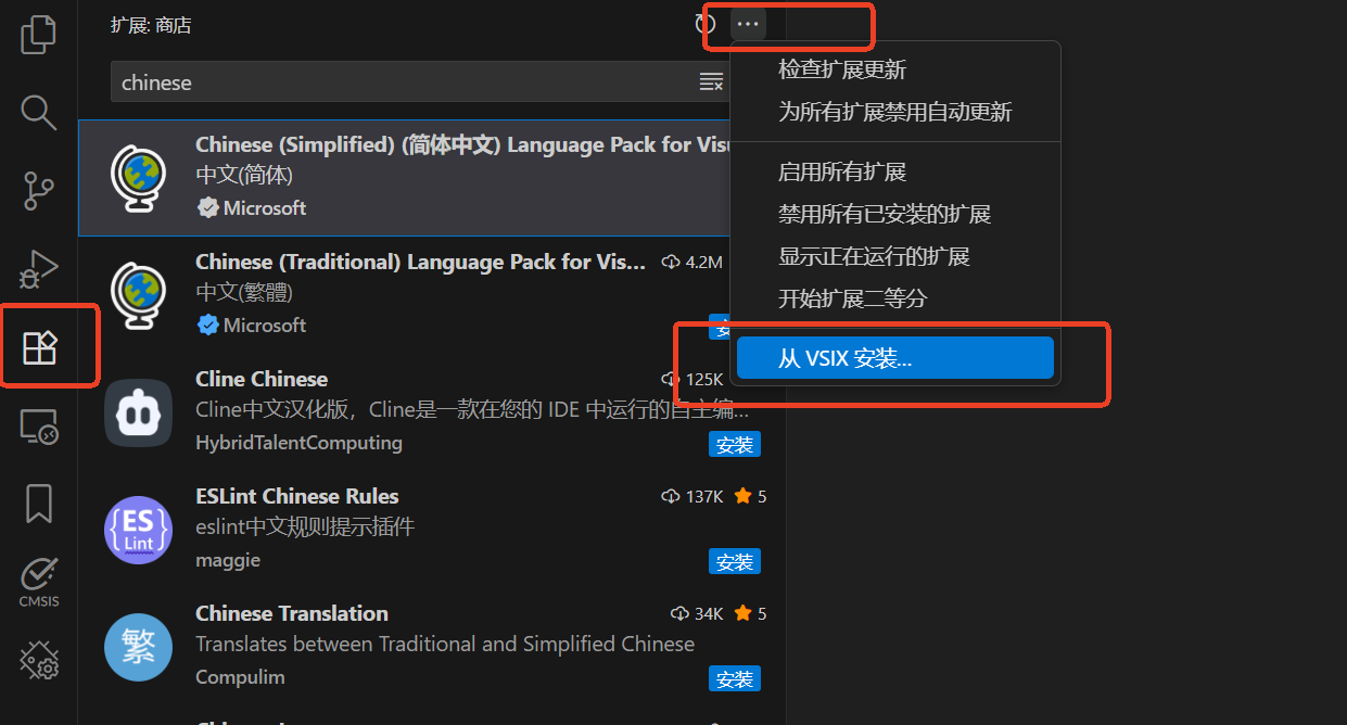 然后,按照下图所示,在插件管理中,依次点击【...】,【从VSIX安装】,选择下载的扩展文件进行安装即可。