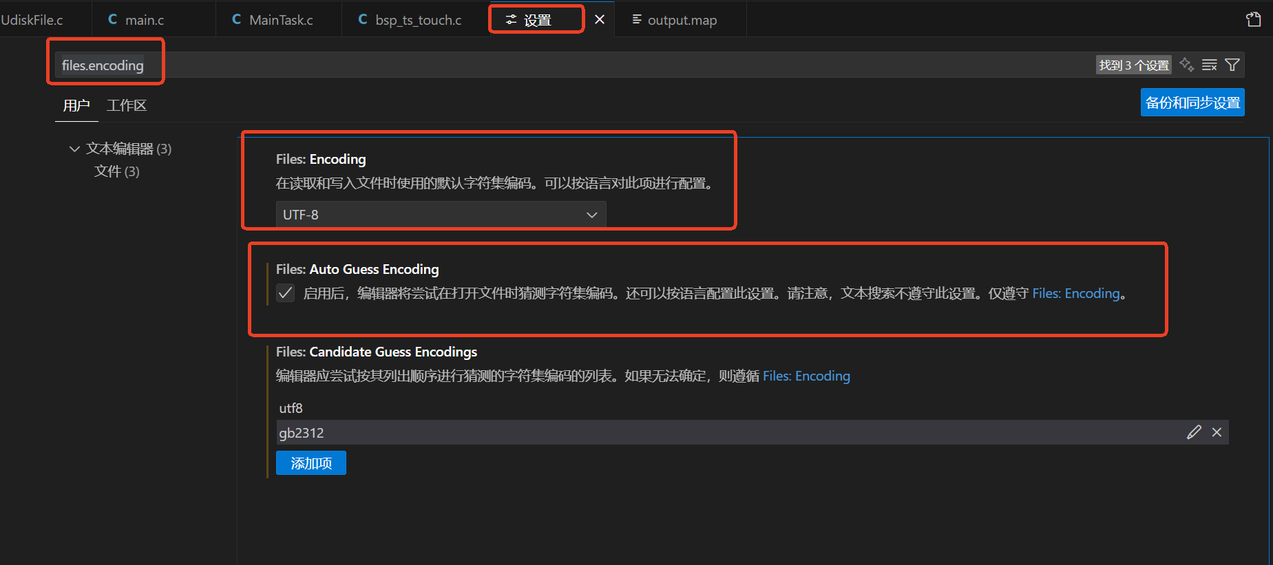 打开设置界面,搜索 files.encoding,按照如下图示,设置编码格式,启用自动检索编码。