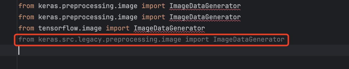 查询资料这个导入失败有可能是keras版本的问题或者导入语句错误引起的,查看是否是有导入语句错误引起,将from keras.preprocessing.image import ImageDataGenerator改为from tensorflow.keras.preprocessing.image import ImageDataGenerator,结果还是导入不成功。查看是否由keras版本的问题引起的,将导入语句改为下面的成功。