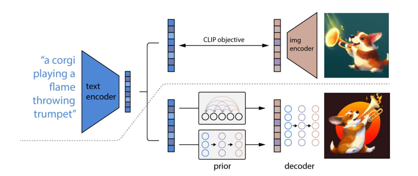 【DALLE·2/unCLIP】基于CLIP的分层文本条件图像生成 Hierarchical Text-Conditional Image Generation with CLIP Latents 作者提出了一个两阶段的模型:前一阶段prior根据给定的文本描述,生成类似于CLIP的图像特征。作者在prior阶段尝试了自回归模型和扩散模型,发现使用扩散模型计算效率高且生成样本质量高。后一阶段decoder根据图像特征生成图像,在decoder阶段使用的同样是扩散模型。