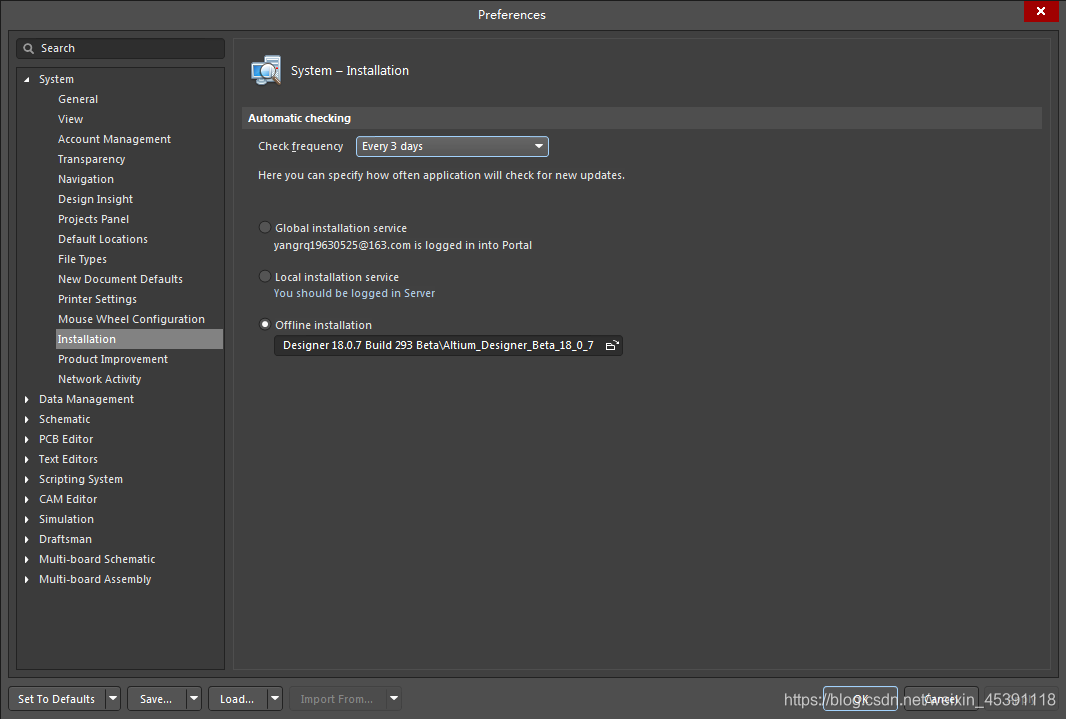 Altium Designer 18的"系统-安装"页面在"首选项"对话框中,提供自动检查更新的选项。用户可设定检查频率,如从不、启动时、每天等,并选择使用全局或本地安装服务,同时支持离线安装。