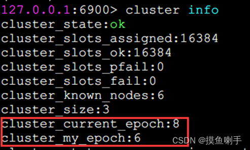 配置纪元是一个只增不减的整数,每个主节点自身维护一个配置纪元(clusterNode .configEpoch)标示当前主节点的版本,所有主节点的配置纪元都不相等,从节点会复制主节点的配置纪元。整个集群又维护一个全局的配置纪元(clusterstate.currentEpoch),用于记录集群内所有主节点配置纪元的最大版本。执行cluster info命令可以查看配置纪元信息: