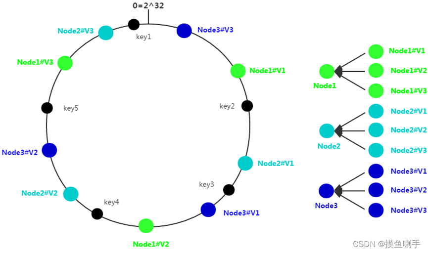 为了在增删节点的时候,各节点能够保持动态的均衡,将每个真实节点虚拟出若干个虚拟节点,再将这些虚拟节点随机映射到环上。此时每个真实节点不再映射到环上,真实节点只是用来存储键值对,它负责接应各自的一组环上虚拟节点。当对键值对进行存取路由时,首先路由到虚拟节点上,再由虚拟节点找到真实的节点。