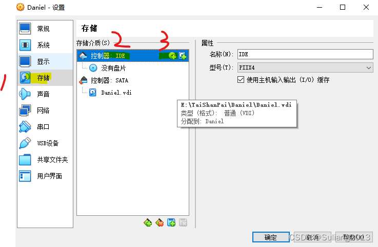 2. 点<存储>,选中<控制器>,点那个<光盘加号图标>,添加虚拟光驱