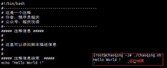 五、Shell 注释 以井号(#)来注释单行,Shell 并不会处理 Shell 脚本中的注释行。然而 Shell 脚本第一行是个例外,# 号后面的感叹号(!)是用来告诉系统用哪个解释器来运行脚本。表示开启 Here 文档,COMMENT 是 Here 文档的标识符,只需要在两个标识符之间的内容都会被视为注释,不会被执行。是一个空命令,用于捃后面的 Here 文档,