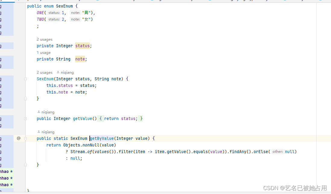 hanLP集合枚举,实现名词提取 最后我们可以根据分词以后的。取到每个词语的词性,用于判断这个词性是否在名词枚举集合中,如果集合中则返回这个词。做名词提取功能的实现。以最简单的男女为例。出现男性女性以外的性别枚举类里面判断不认可。但是这上百种词性我们不是每种都会用到,我们只需要名词。把只与名词相关的枚举值存储起来。getByValue是判断外部传进来的性别是否再枚举里,如果是的话则返回,不是的话则返回null.当然也可以利用枚举类里面进行分类。比如hanLP里面的词性有上百种。可以用这个返回的null配合自己定义的异常类抛出异常。