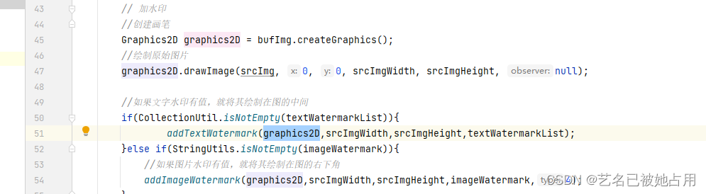 java实现图片文字水印自适应功能 /-------------------------文字水印 start----------------------------//设置字体 画笔字体样式为微软雅黑,加粗,文字大小为60pt。//根据图片的背景设置水印颜色。