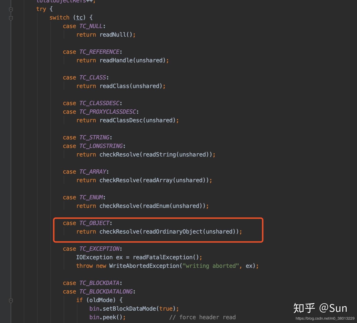 进入ObjectInputStream#readObject0(),switch语句对枚举或者Object类都有对应的序列化机制