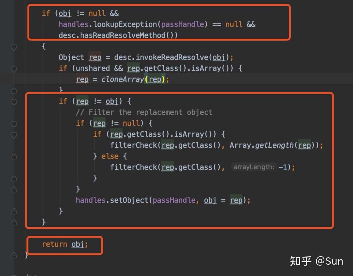 我们要敲黑板了,这里就是单例类中定义readResolve就可以解决问题的关键所在! 若"obj != null &&handles.lookupException(passHandle) == null &&desc.hasReadResolveMethod()"这条语句返回true 就会调用Object rep = desc.invokeReadResolve(obj) 这条语句。