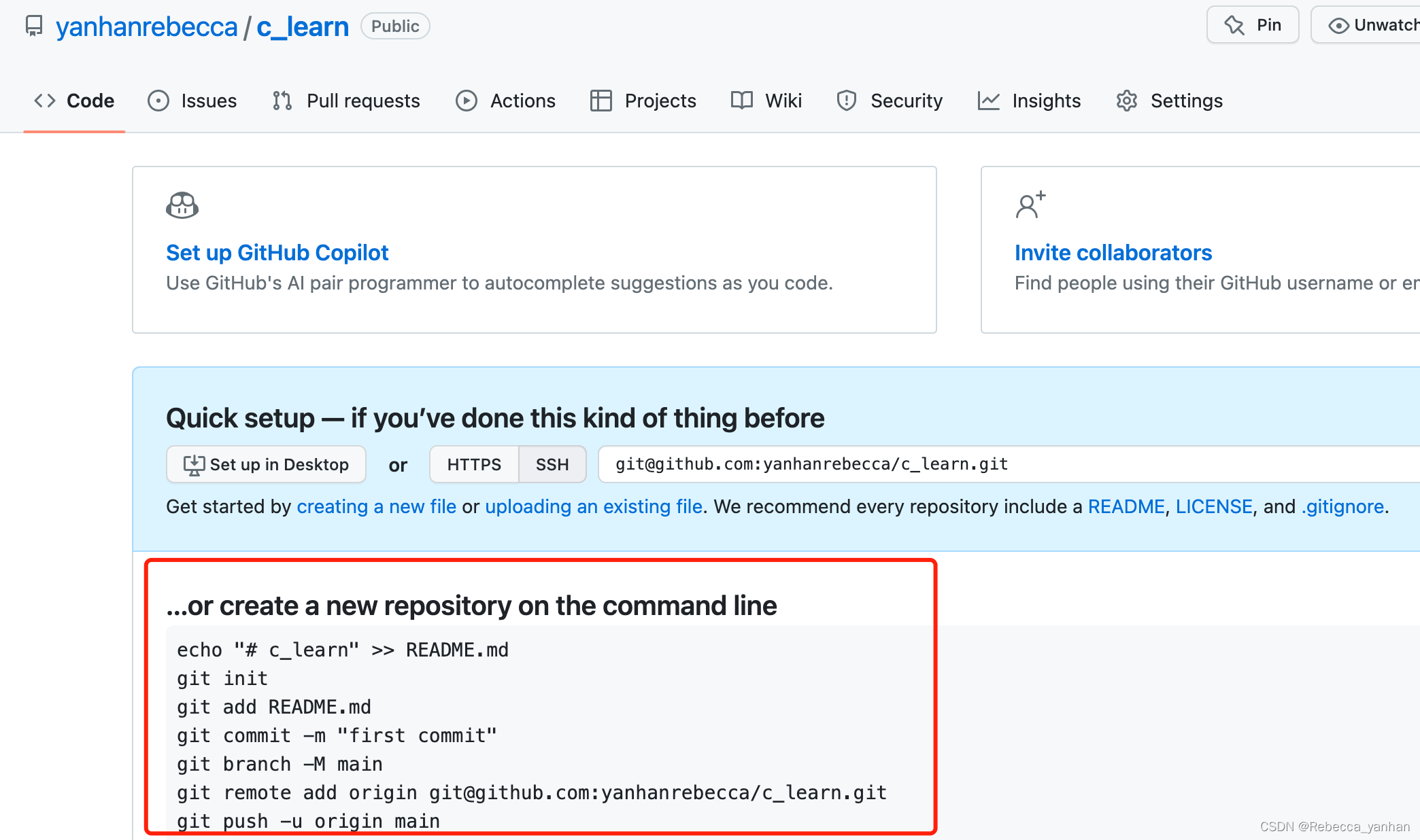 创建好仓库后,github同样会给出很详细的命令行指引,如下图红框所示