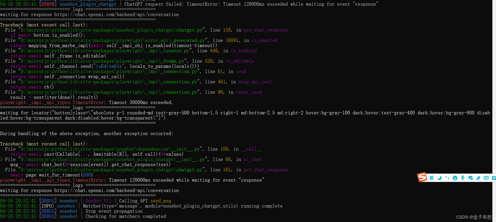 - 参照下列,进行改动。//有新发现。暂时不写了。先实践。[BUG]: ChatGPT超时,无响应,TimeoutError【附解决方法】 · Issue #137 · A-kirami/nonebot-plugin-chatgpt · GitHub