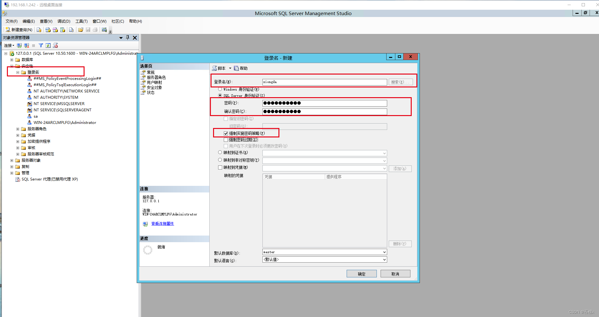 进入【用户映射】在右侧的面板中勾选该账号可以进行管理操作的数据库名称!并在该面板下面的【数据库角色成员身份】中勾选db_owner项!