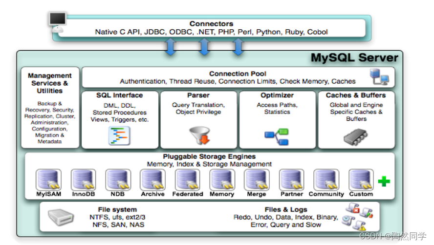 最上层是一些客户端和链接服务,包含本地sock 通信和大多数基于客户端/服务端工具实现的类似于 TCP/IP的通信。主要完成一些类似于连接处理、授权认证、及相关的安全方案。在该层上引入了线程池的概念,为通过认证安全接入的客户端提供线程。同样在该层上可以实现基于SSL的安全链接。服务器也会为安全接入的每个客户端验证它所具有的操作权限。