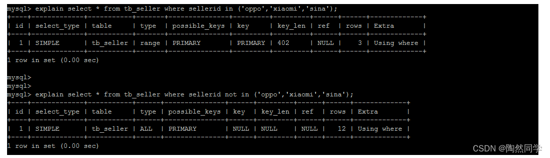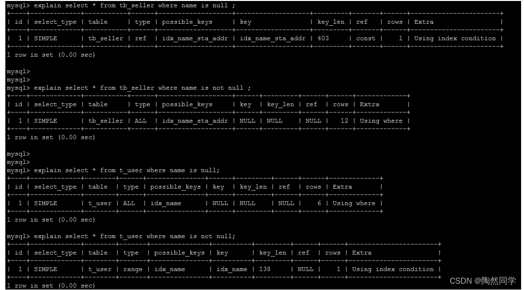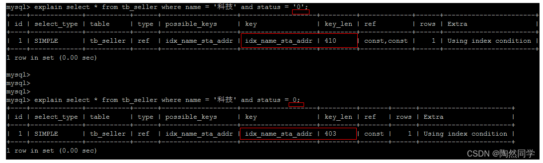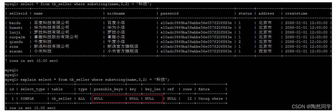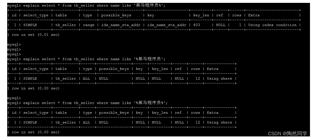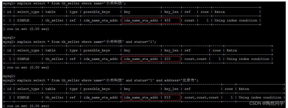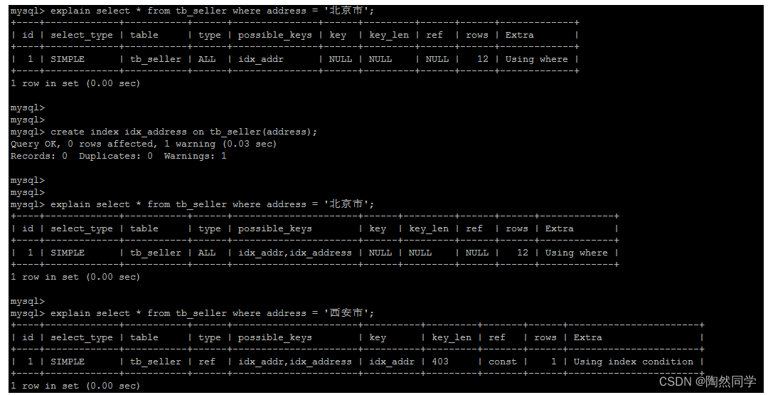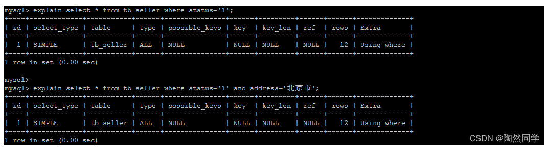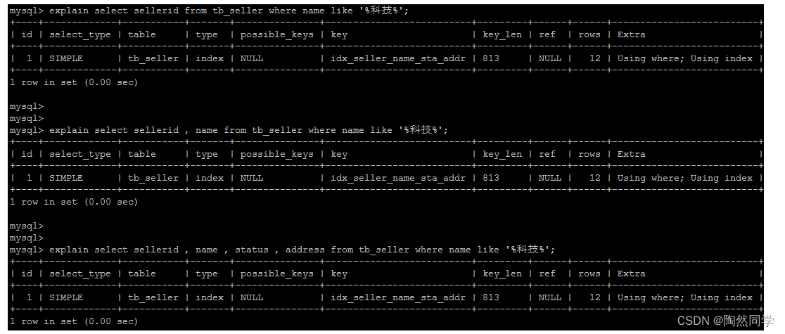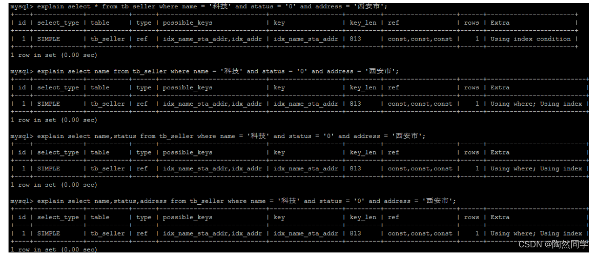 create table `tb_seller` ( `sellerid` varchar (100), `name` varchar (100), `nickname` varchar (50), `password` varchar (60), `status` varchar (1), `address` varchar (100), `createtime` datetime, primary key(`sellerid`) )engine=innodb default charset=utf8mb4; insert into `tb_seller` (`sellerid`, `name`, `nickname`, `password`, `status`, `address`, `createtime`) values('alibaba','阿里巴巴','阿里小店','e10adc3949ba59abbe56e057f20f883e','1','北京市','2088-01-01 12:00:00'); insert into `tb_seller` (`sellerid`, `name`, `nickname`, `password`, `status`, `address`, `createtime`) values('baidu','百度科技有限公司','百度小店','e10adc3949ba59abbe56e057f20f883e','1','北京市','2088-01-01 12:00:00'); insert into `tb_seller` (`sellerid`, `name`, `nickname`, `password`, `status`, `address`, `createtime`) values('huawei','华为科技有限公司','华为小店','e10adc3949ba59abbe56e057f20f883e','0','北京市','2088-01-01 12:00:00'); insert into `tb_seller` (`sellerid`, `name`, `nickname`, `password`, `status`, `address`, `createtime`) values('itcast','传智播客教育科技有限公司','传智播客','e10adc3949ba59abbe56e057f20f883e','1','北京市','2088-01-01 12:00:00'); insert into `tb_seller` (`sellerid`, `name`, `nickname`, `password`, `status`, `address`, `createtime`) values('itheima','黑马程序员','黑马程序员','e10adc3949ba59abbe56e057f20f883e','0','北京市','2088-01-01 12:00:00'); insert into `tb_seller` (`sellerid`, `name`, `nickname`, `password`, `status`, `address`, `createtime`) values('luoji','罗技科技有限公司','罗技小店','e10adc3949ba59abbe56e057f20f883e','1','北京市','2088-01-01 12:00:00'); insert into `tb_seller` (`sellerid`, `name`, `nickname`, `password`, `status`, `address`, `createtime`) values('oppo','OPPO科技有限公司','OPPO官方旗舰店','e10adc3949ba59abbe56e057f20f883e','0','北京市','2088-01-01 12:00:00'); insert into `tb_seller` (`sellerid`, `name`, `nickname`, `password`, `status`, `address`, `createtime`) values('ourpalm','掌趣科技股份有限公司','掌趣小店','e10adc3949ba59abbe56e057f20f883e','1','北京市','2088-01-01 12:00:00'); insert into `tb_seller` (`sellerid`, `name`, `nickname`, `password`, `status`, `address`, `createtime`) values('qiandu','千度科技','千度小店','e10adc3949ba59abbe56e057f20f883e','2','北京市','2088-01-01 12:00:00'); insert into `tb_seller` (`sellerid`, `name`, `nickname`, `password`, `status`, `address`, `createtime`) values('sina','新浪科技有限公司','新浪官方旗舰店','e10adc3949ba59abbe56e057f20f883e','1','北京市','2088-01-01 12:00:00'); insert into `tb_seller` (`sellerid`, `name`, `nickname`, `password`, `status`, `address`, `createtime`) values('xiaomi','小米科技','小米官方旗舰店','e10adc3949ba59abbe56e057f20f883e','1','西安市','2088-01-01 12:00:00'); insert into `tb_seller` (`sellerid`, `name`, `nickname`, `password`, `status`, `address`, `createtime`) values('yijia','宜家家居','宜家家居旗舰店','e10adc3949ba59abbe56e057f20f883e','1','北京市','2088-01-01 12:00:00'); create index idx_seller_name_sta_addr on tb_seller(name,status,address);4.2.2 避免索引失效