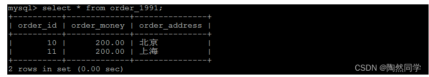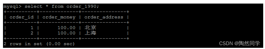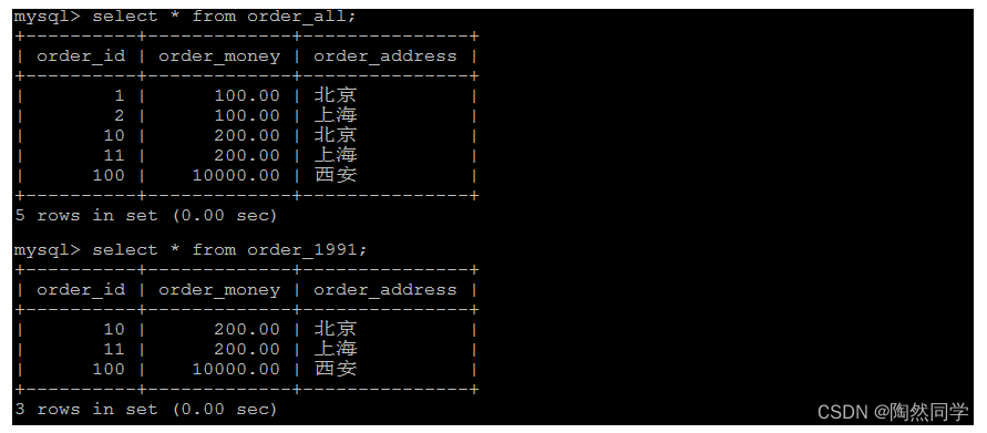 insert into order_1990 values(1,100.0,'北京'); insert into order_1990 values(2,100.0,'上海'); insert into order_1991 values(10,200.0,'北京'); insert into order_1991 values(11,200.0,'上海');