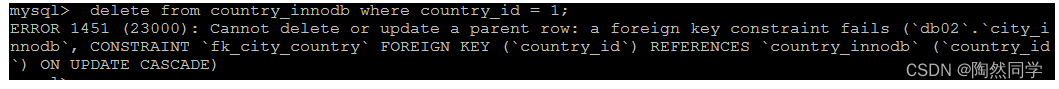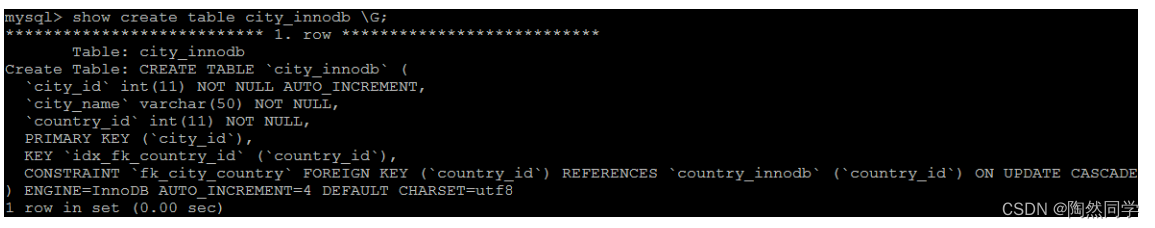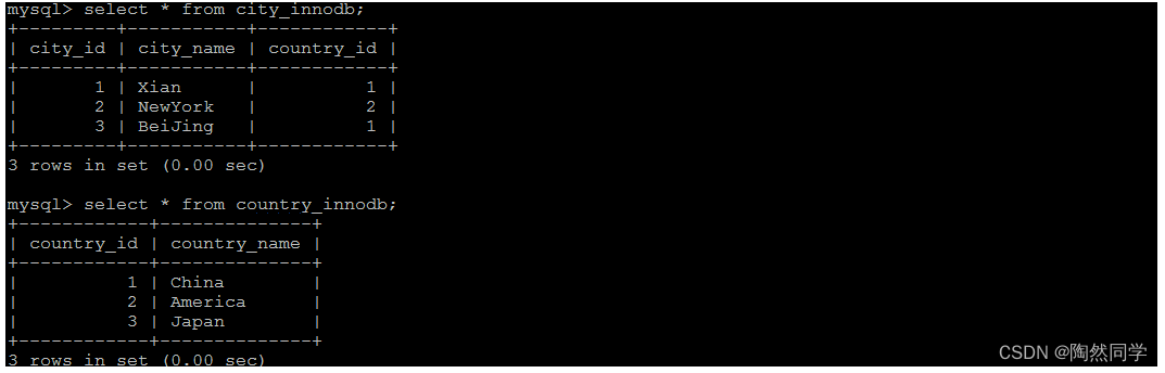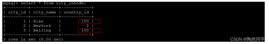 下面两张表中 , country_innodb是父表 , country_id为主键索引,city_innodb表是子表,country_id字段为外键,对应于country_innodb表的主键country_id 。