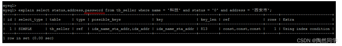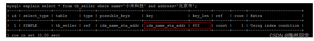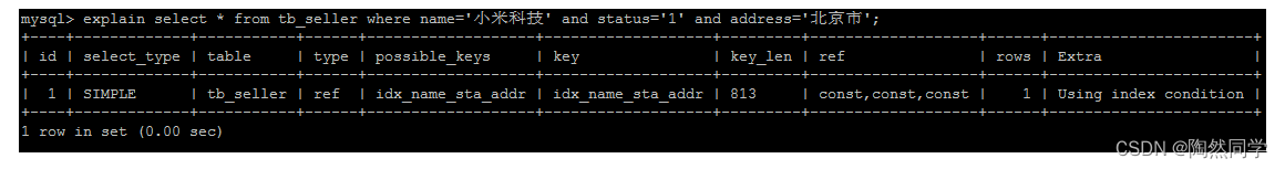 explain select * from tb_seller where name='小米科技' and status='1' and address='北京市';