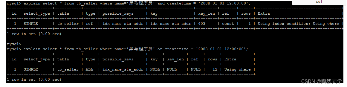 explain select * from tb_seller where name='黑马程序员' or createtime = '2088-01-01 12:00:00';