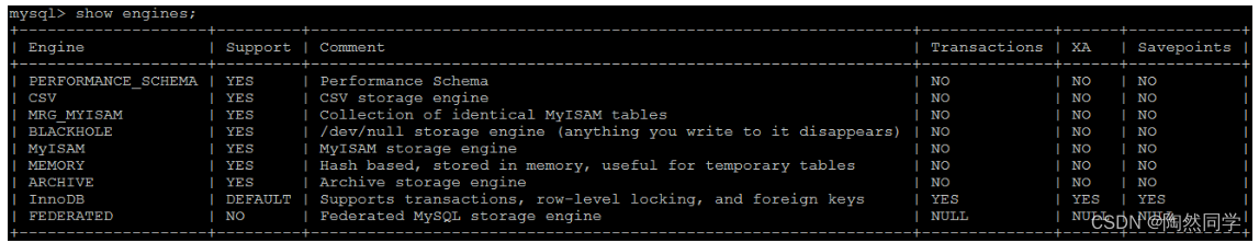 可以通过指定 show engines , 来查询当前数据库支持的存储引擎 :