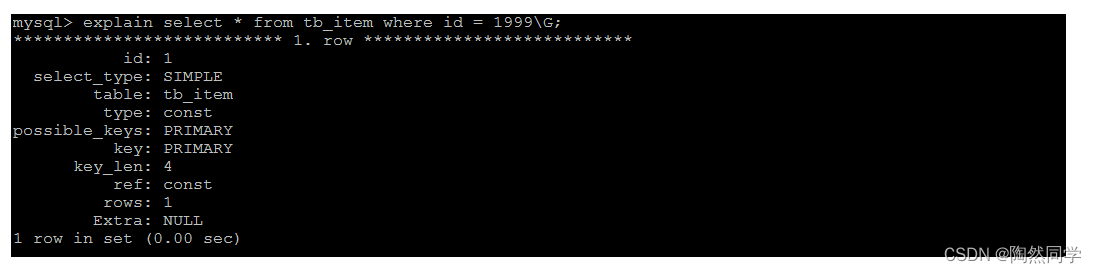 查询速度很快, 接近0s , 主要的原因是因为id为主键, 有索引;