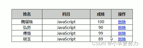 // 行里面创建单元格 td 单元格的数量取决于每个对象里面的属性个数 使用for 循环遍历对象