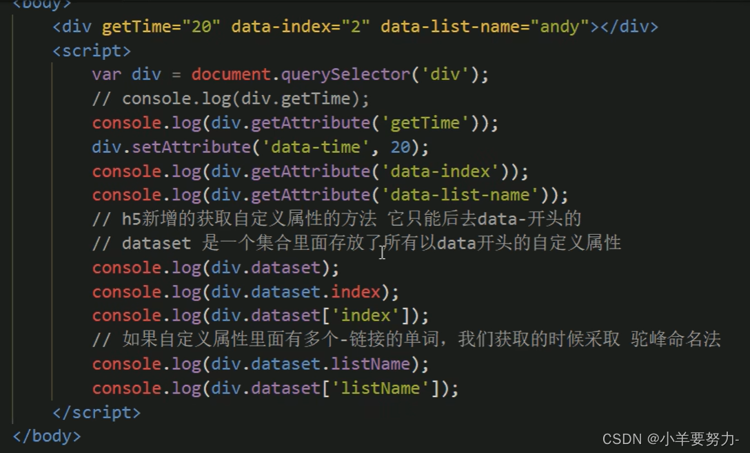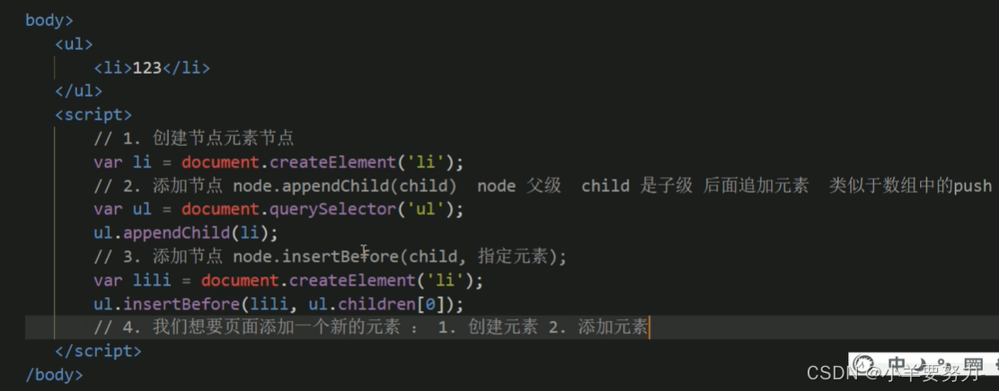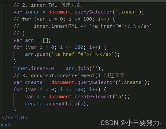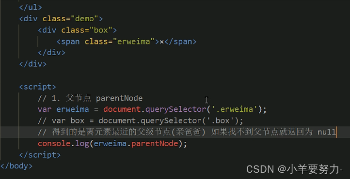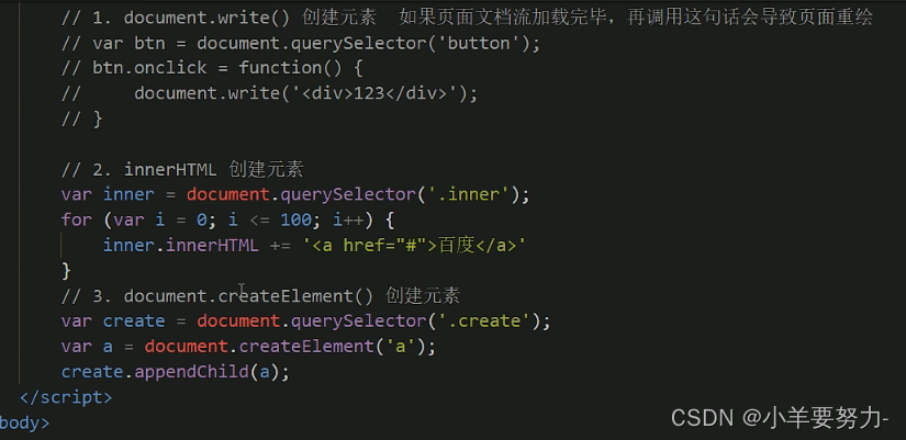 // 1、因为文档页面从上往下加载,所以得先有标签,所以script写在标签下面